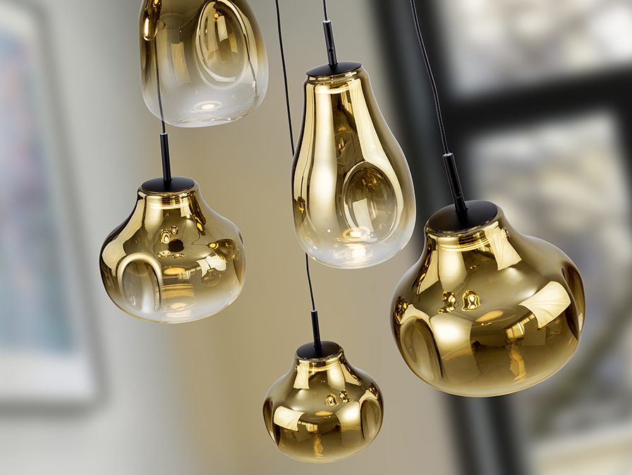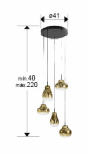 Lámpara de 5 luces realizada en metal acabado negro mate. Tulipas de cristal soplado, en dorado difuminado a transparente. Regulable en altura. 30W LED, 1800 lm, 3.000 K.
