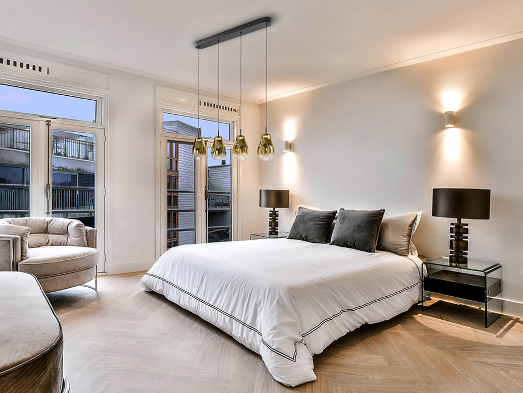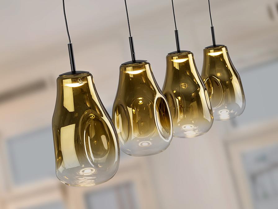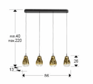 Lámpara de 4 luces realizada en metal acabado negro mate. Tulipas de cristal soplado, en dorado difuminado a transparente. Regulable en altura. 24W LED, 1.400 lm, 3.000 K.