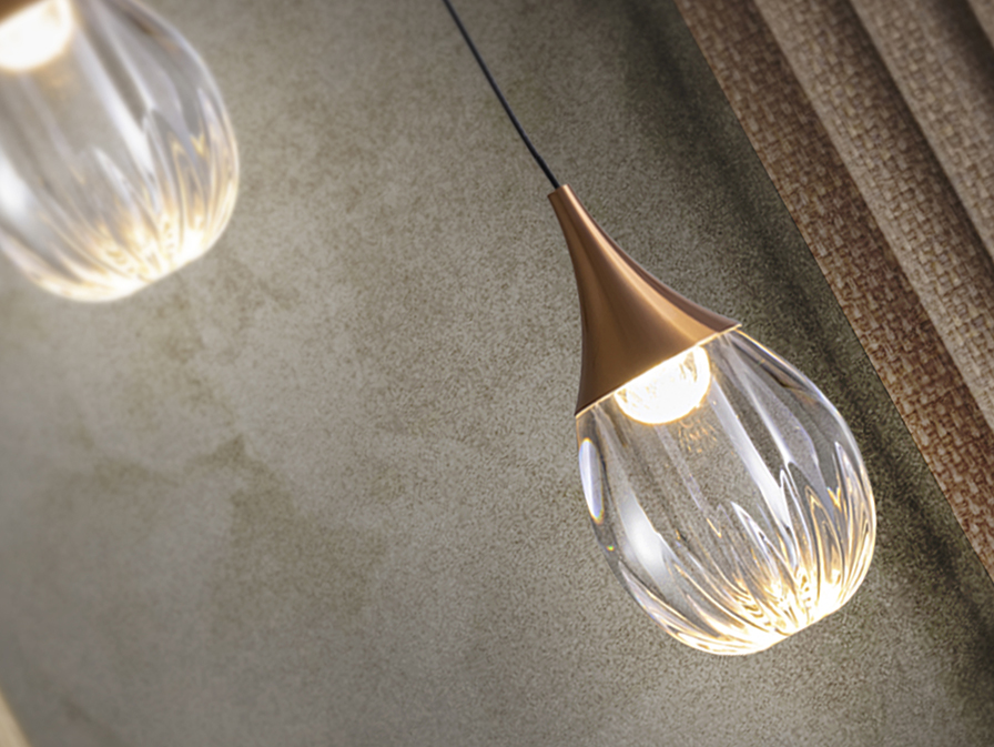 Lámpara de 1 luz realizada en metal acabado negro mate y detalles en cobre. Tulipas moldeadas de acrílico transparente. Regulable en altura. 6W LED, 3.000 K.
